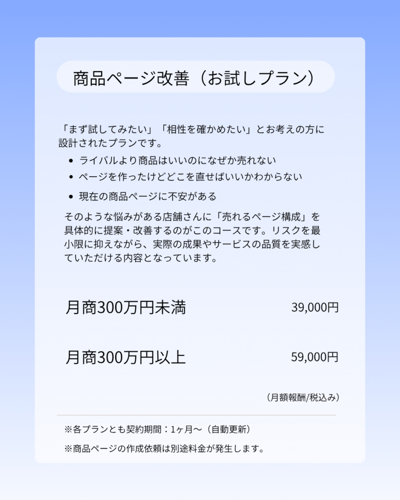 まずは始めやすい「商品ページ改善コース」をおススメします。