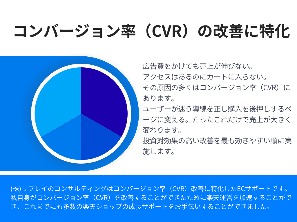 自身でEC運営を経験し、成功も失敗も肌で感じてきました。その現場の知見を活かし、単なる理論や表面的なアドバイスにとどまらず、具体的で実践的な改善策を提案します。楽天市場に特化した豊富な経験を基に売上が伸び悩む原因を掘り下げ、CVR(転換率)の改善に注力。
